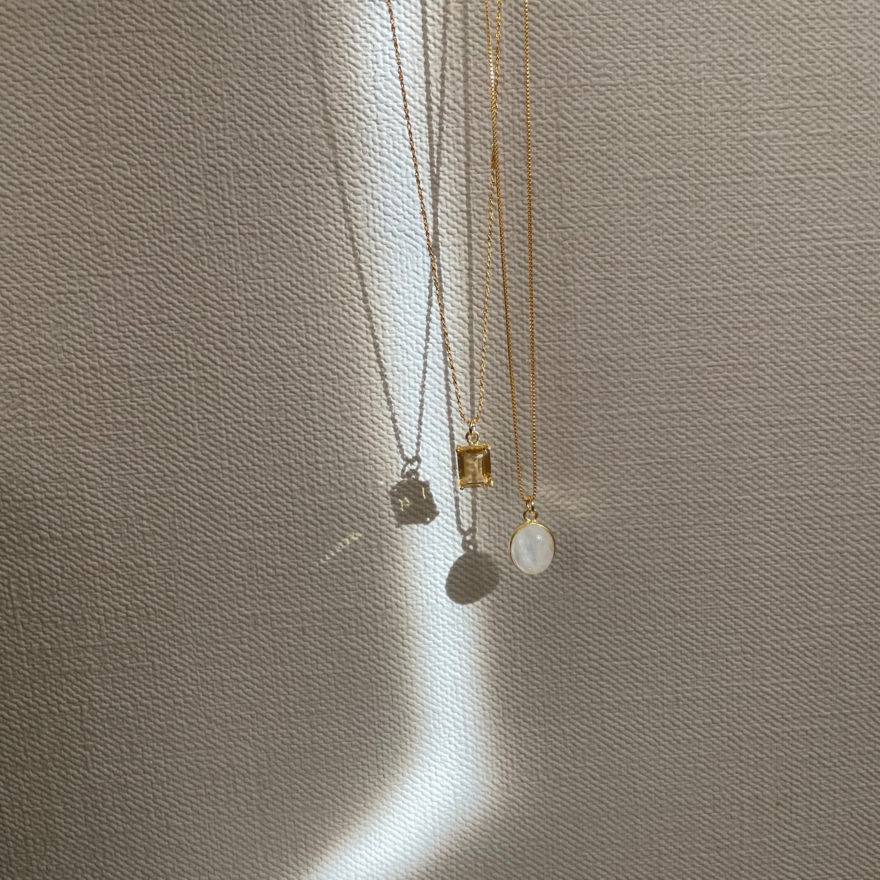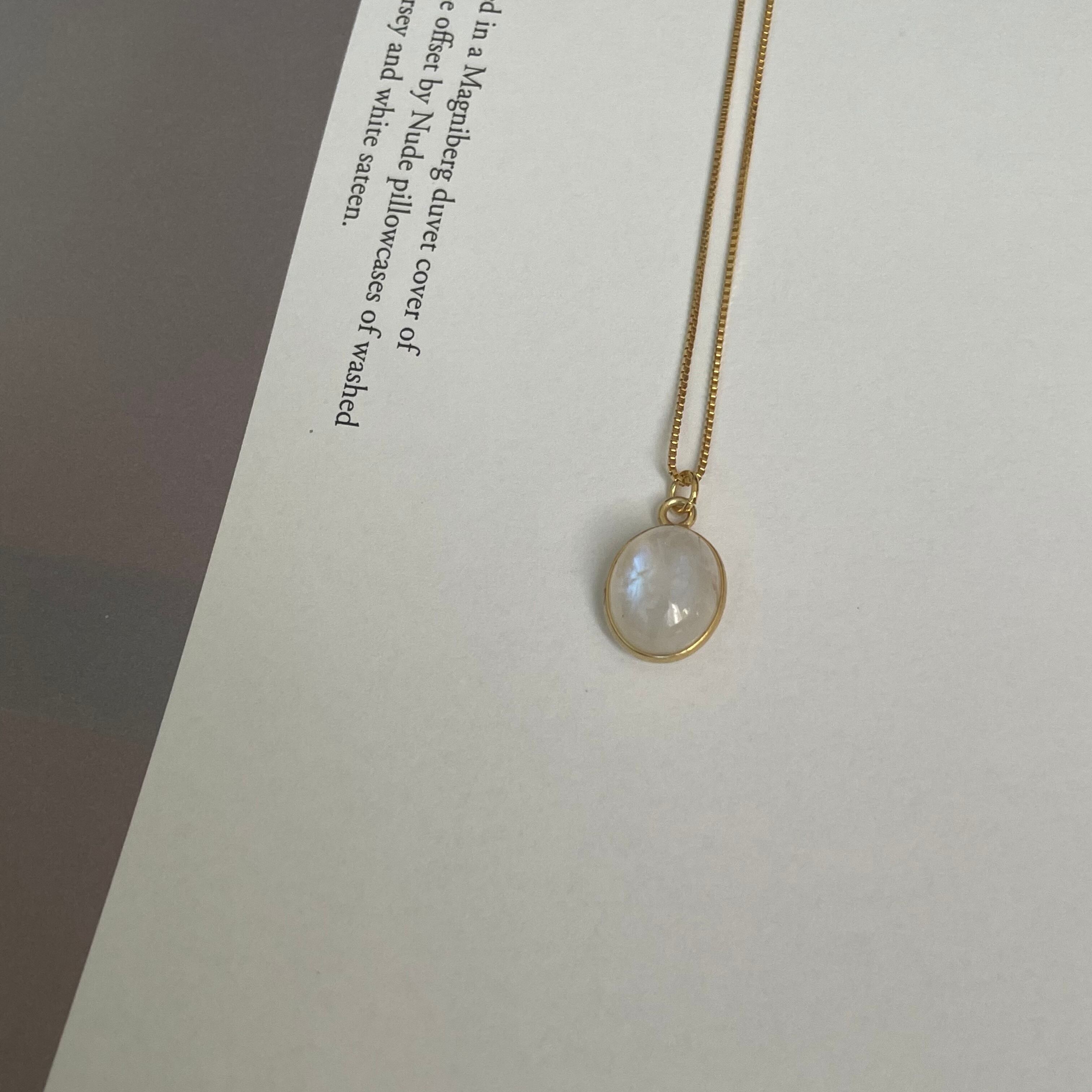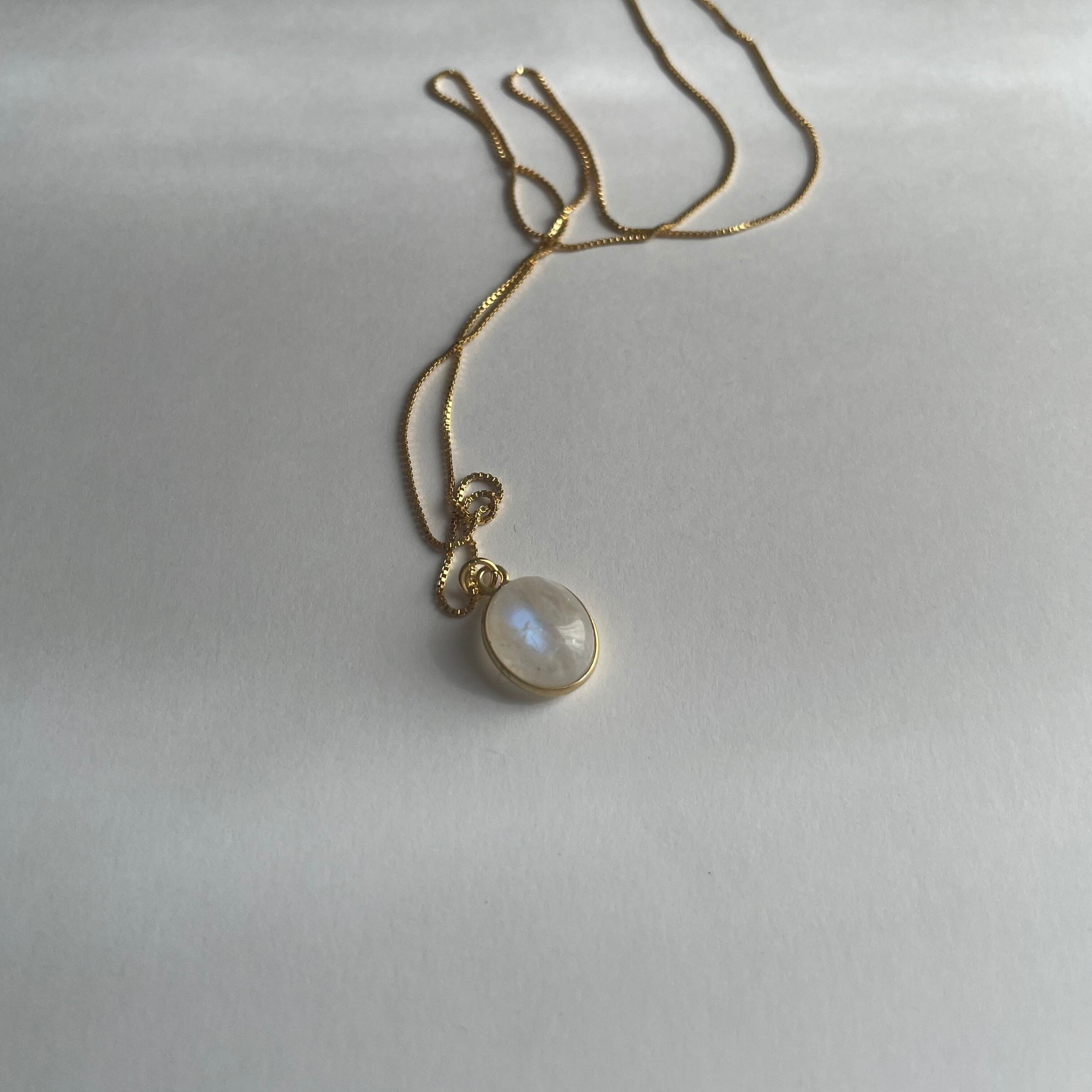 光の角度で表情が変わるrainbow moon stoneの輝きが美しいネックレス。