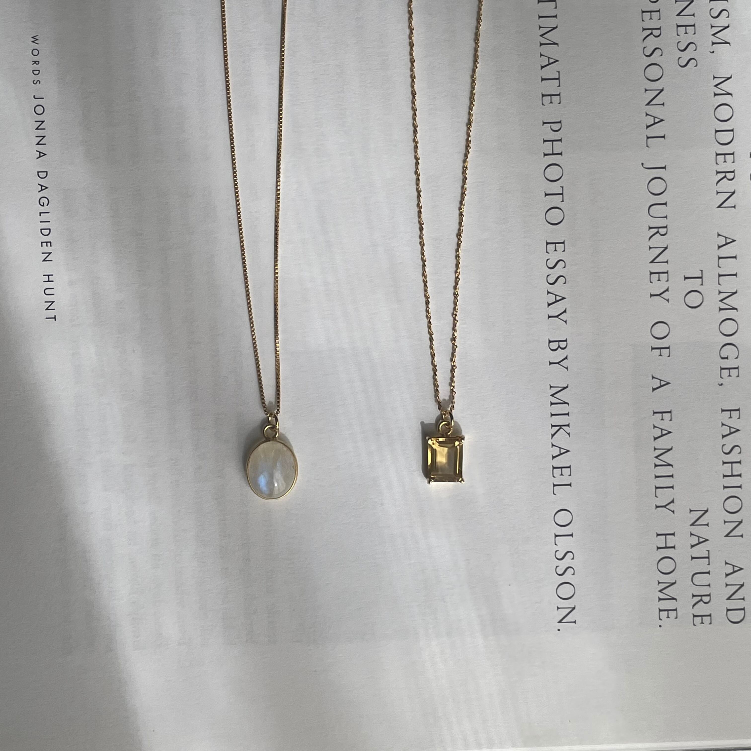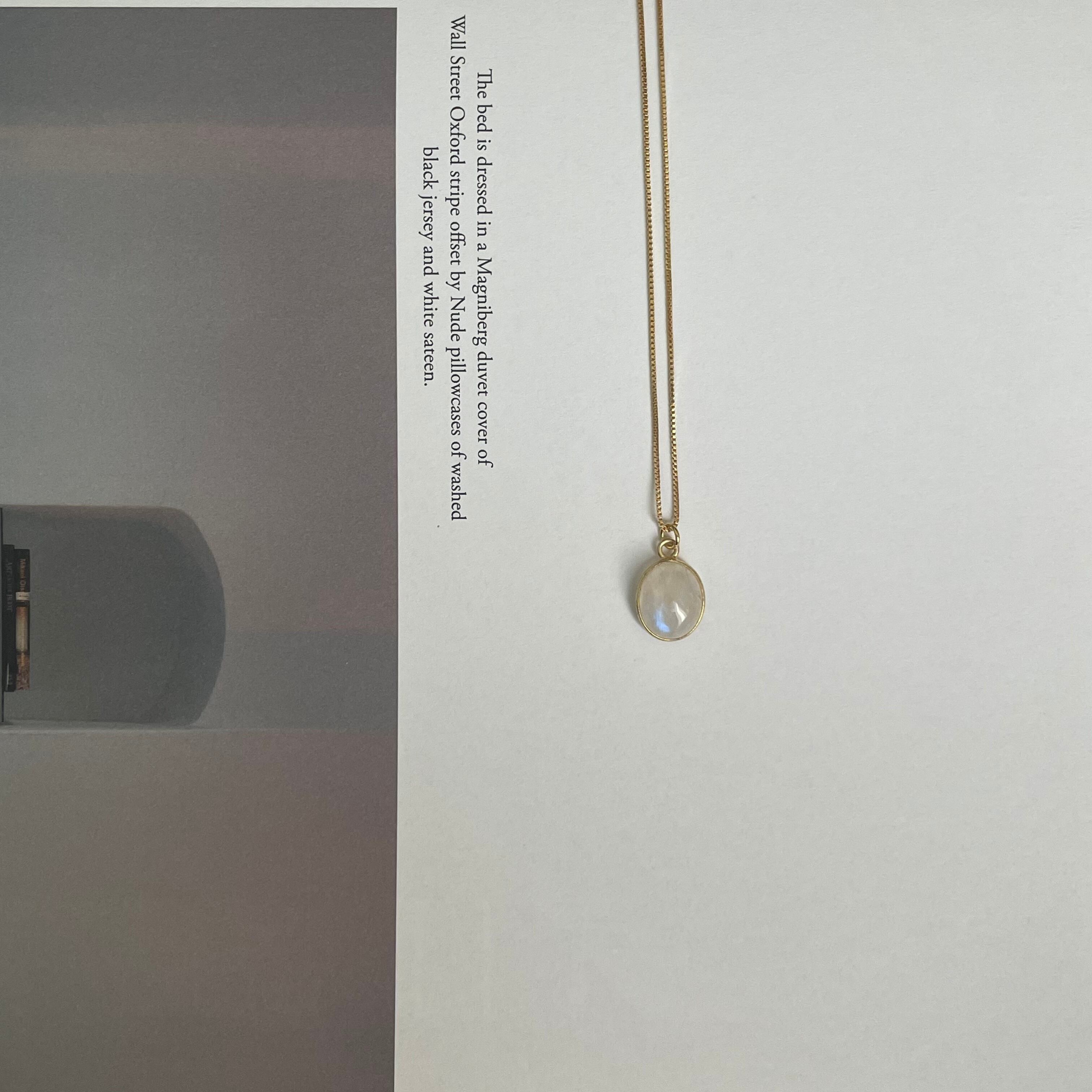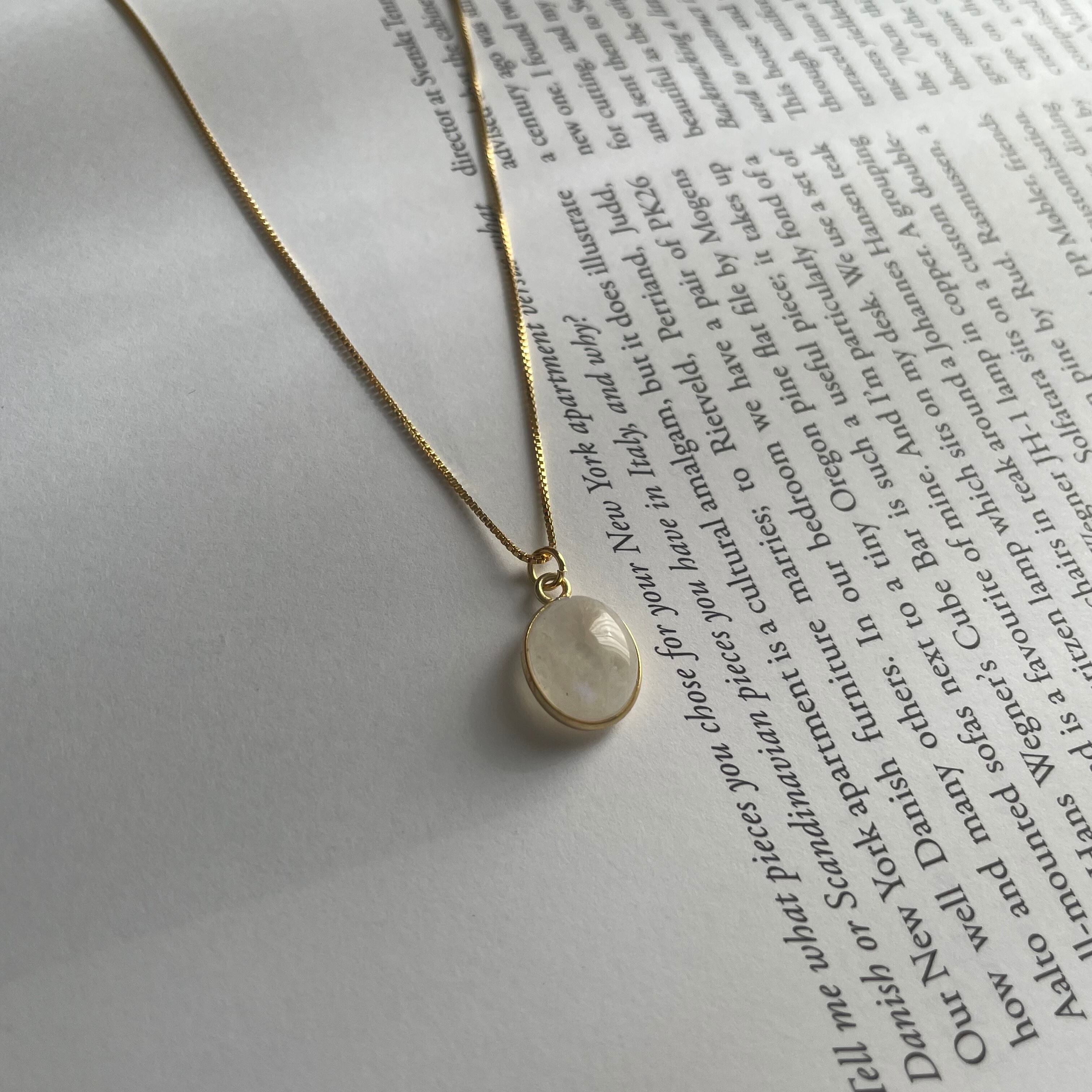 光の角度で表情が変わるrainbow moon stoneの輝きが美しいネックレス。