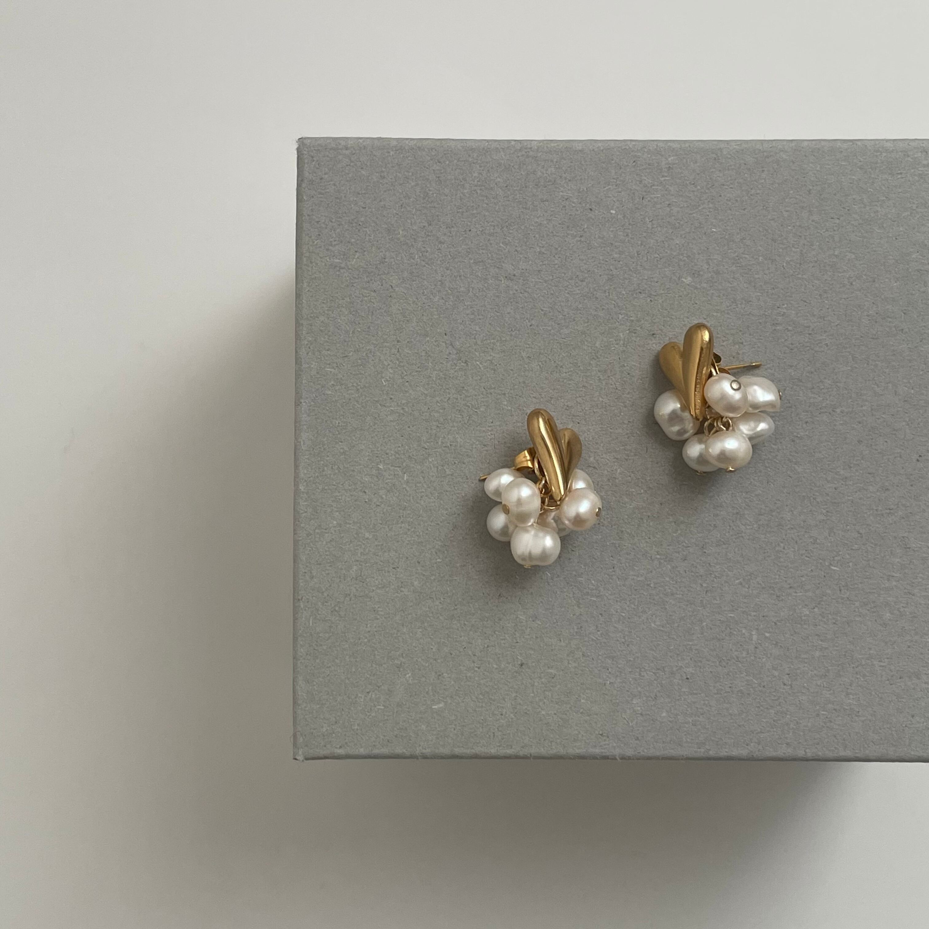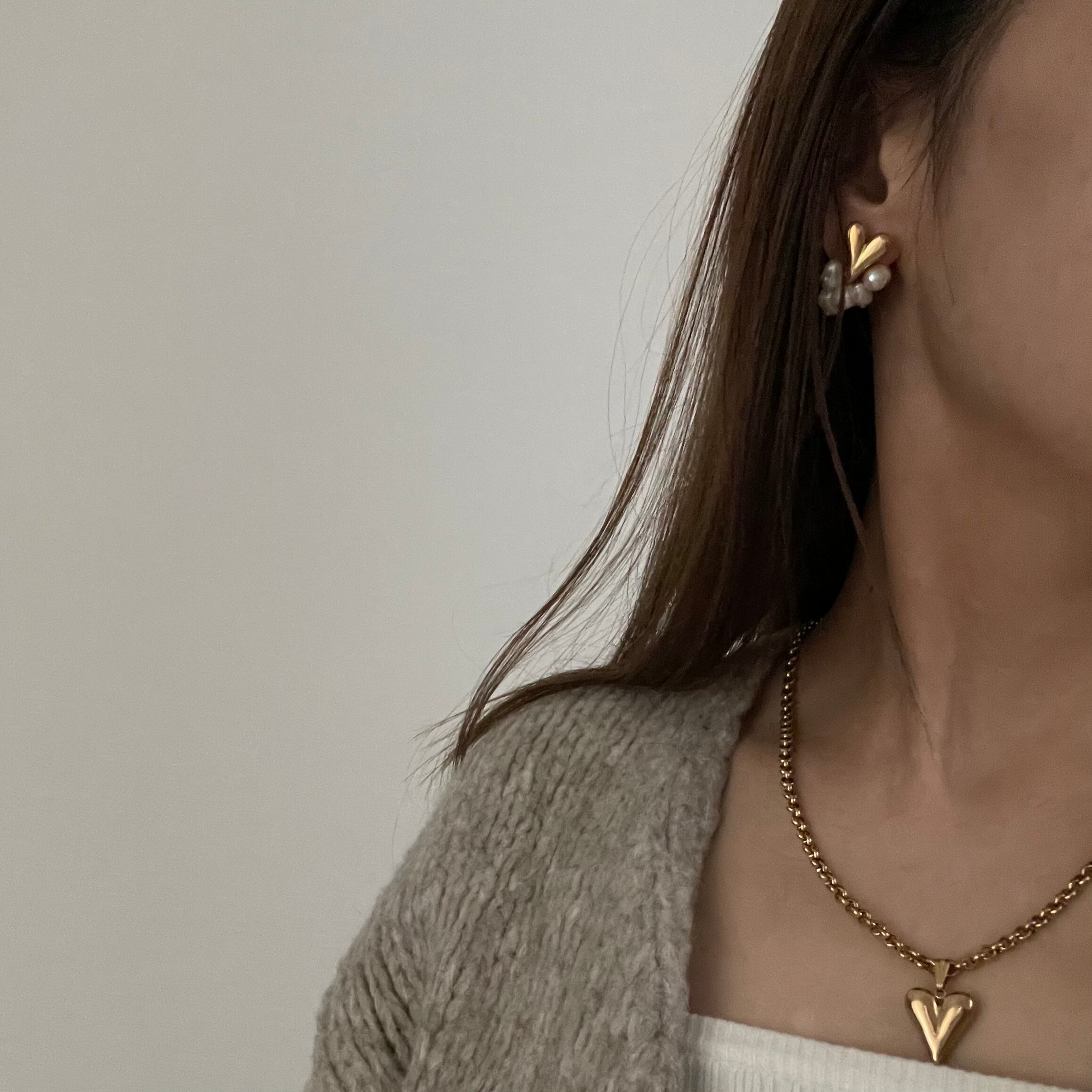 大人っぽいシルエットのハートに小粒のパールが揺れるデザインのピアス。