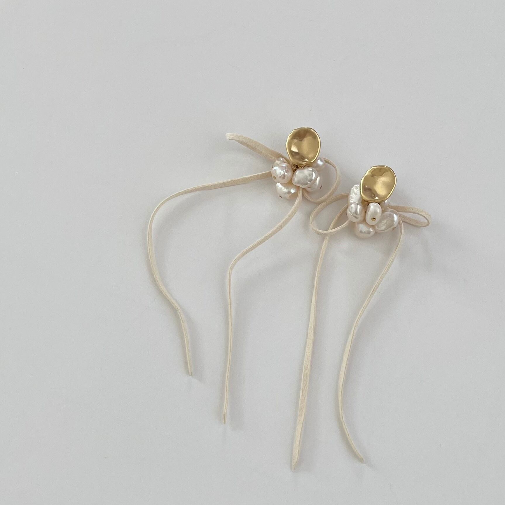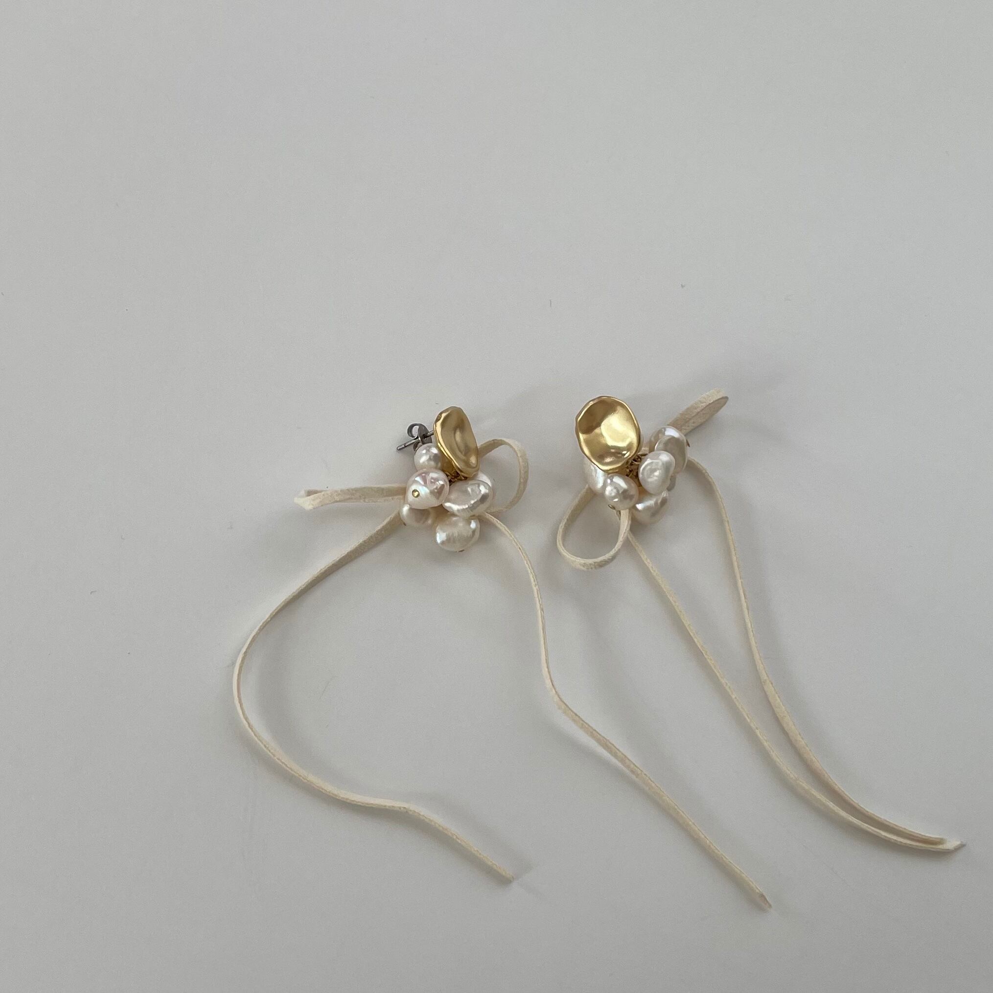淡水パールとメタルのトップに、レザーリボンがついているデザインピアス・イヤリング。