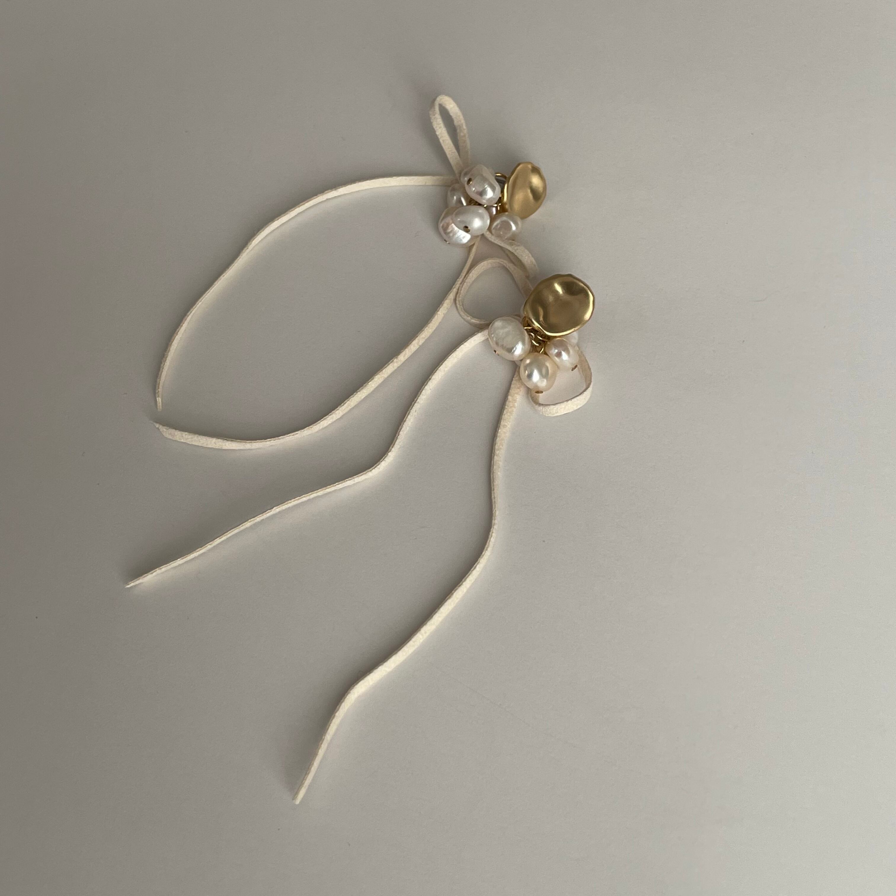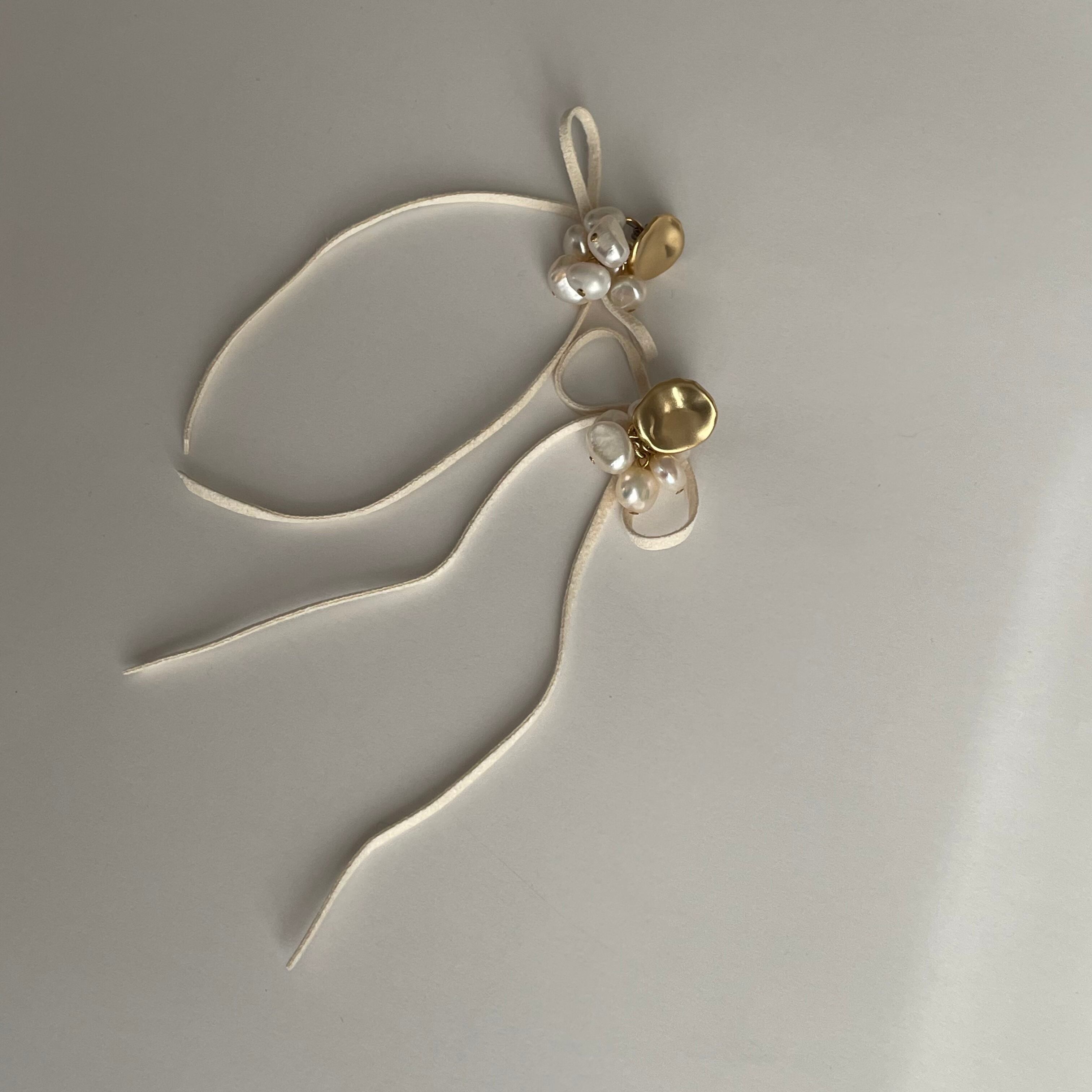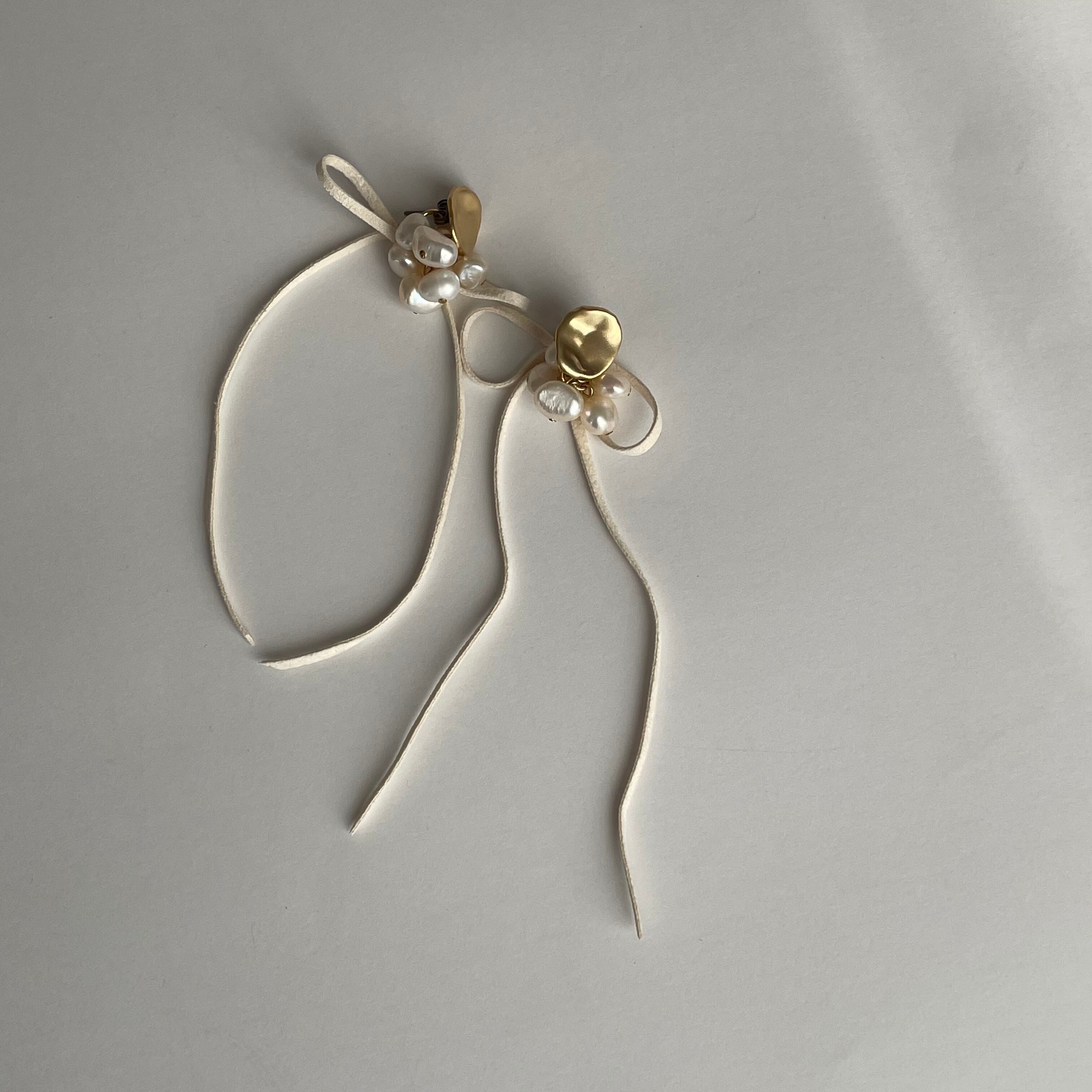 pearl × leather ribbon 2way earring / pierce (gold×milk)