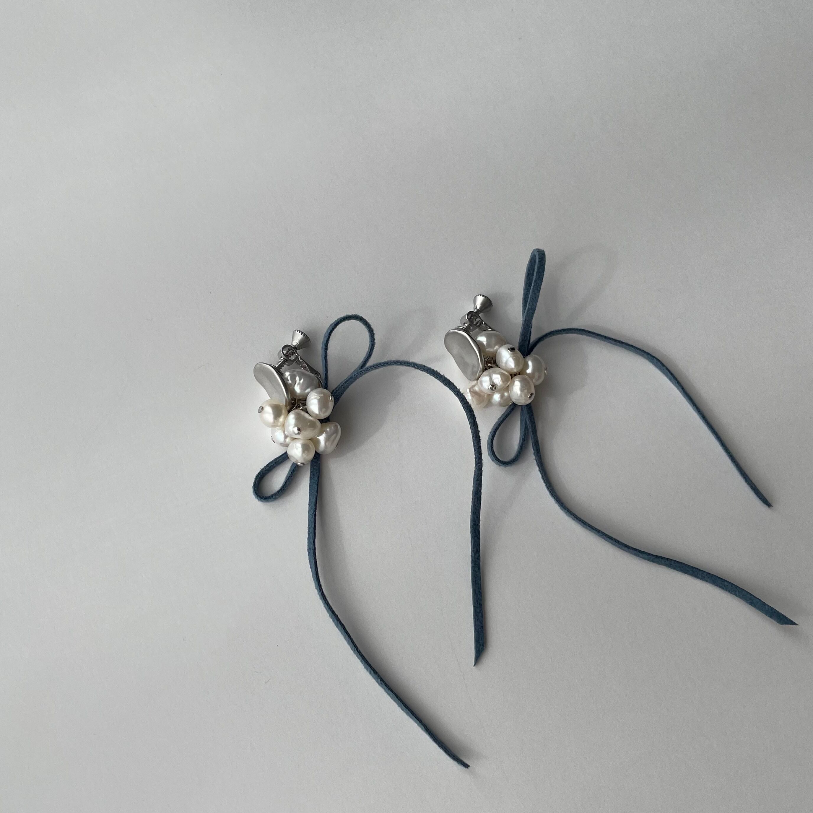 pearl × leather ribbon 2way earring / pierce (silver×blue)
