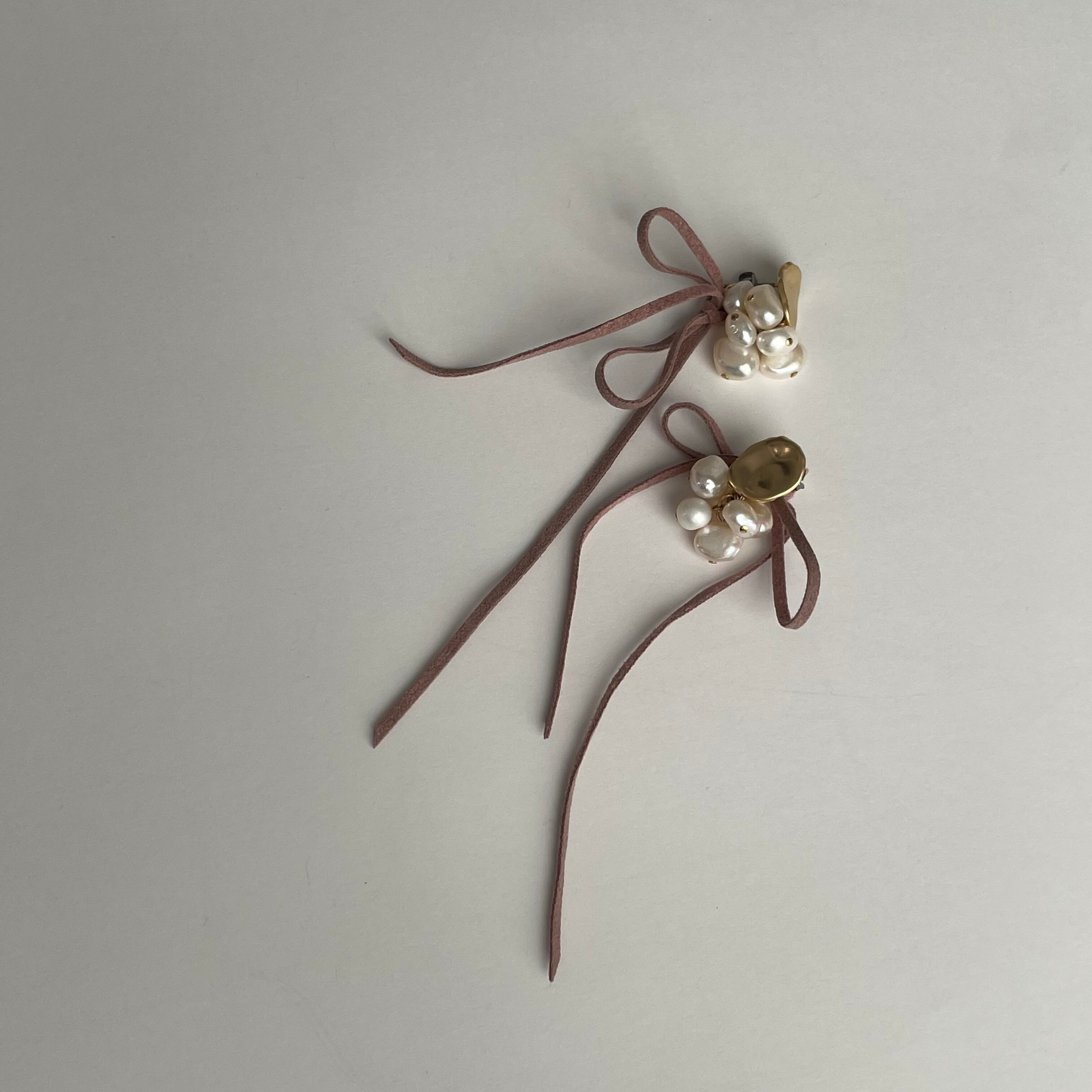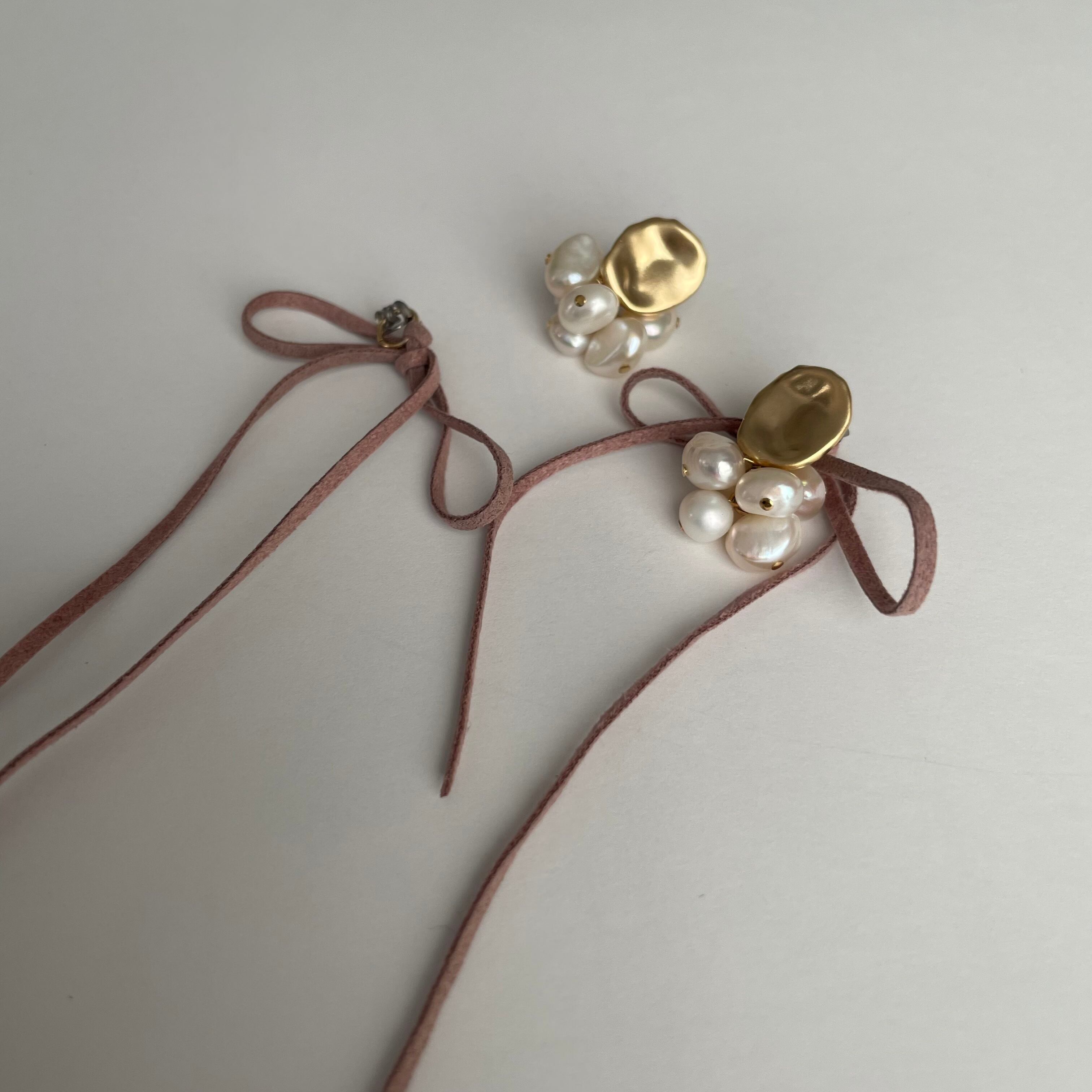 pearl × leather ribbon 2way earring / pierce (gold×rose)